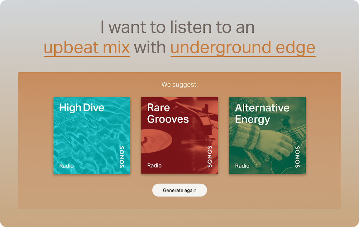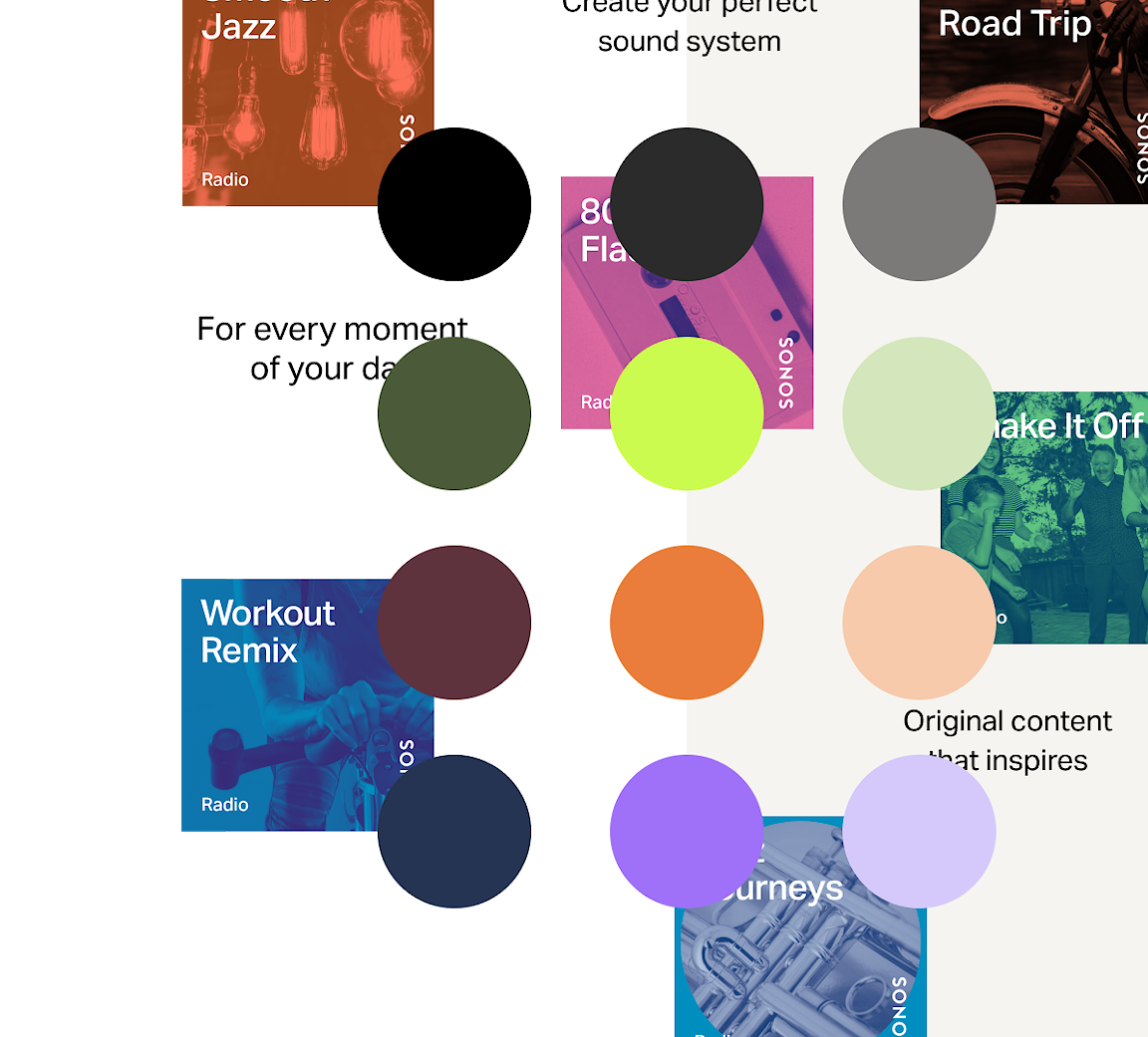 An original design featured a wave of twelve colors that embraced the genre buttons. Upon further discovery, we adjusted the rows to be more readable and introduced the Sonos muted grayscale to stay on brand.