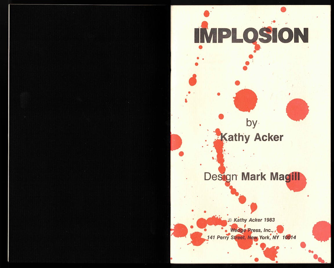 Kathy Acker was a visual writer. Reading her writing is like getting a tattoo on your brain. Her words coagulate into dense imagery—violent, messy, pornographic, sometimes all three and always indelible. This inclination towards the imagistic can also be seen in the frequent inclusion of illustrations alongside her texts. Implosion is no exception.