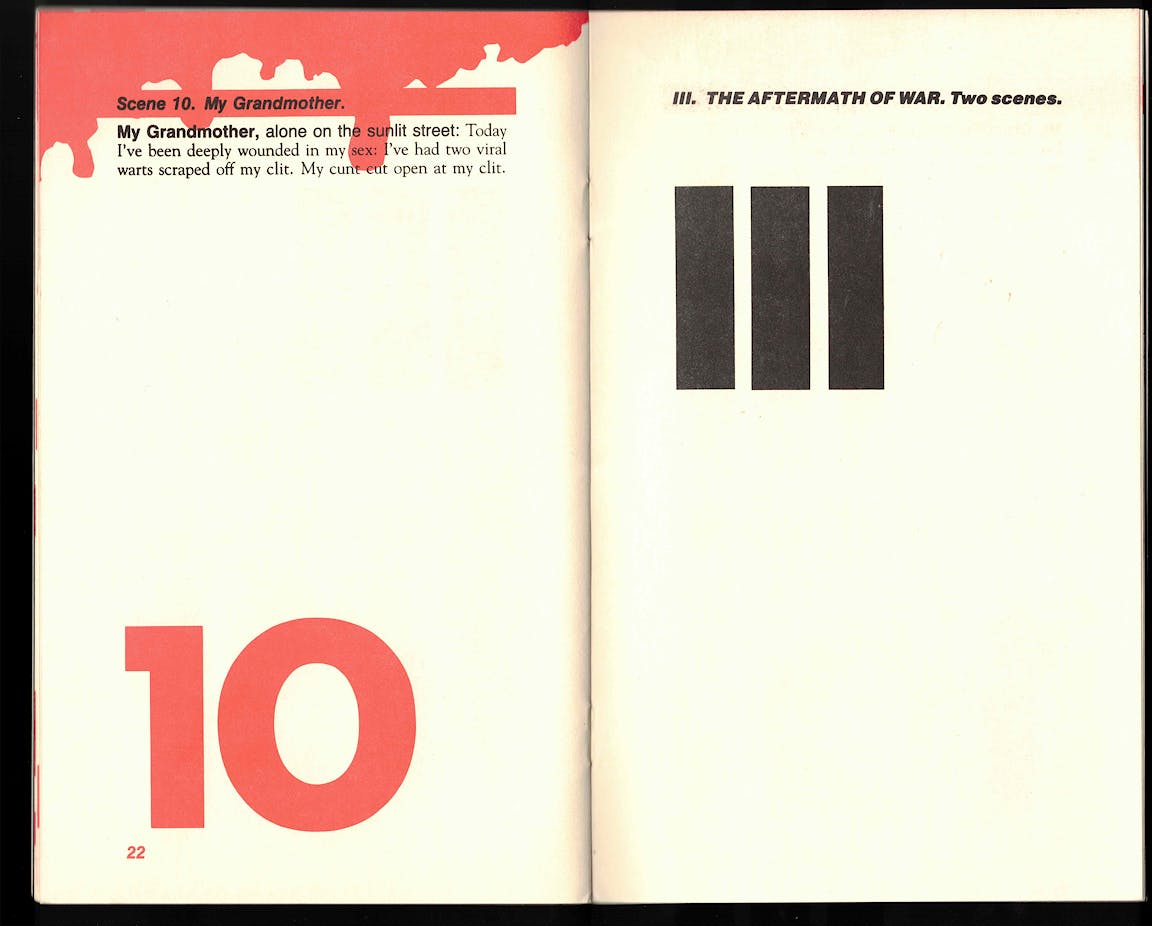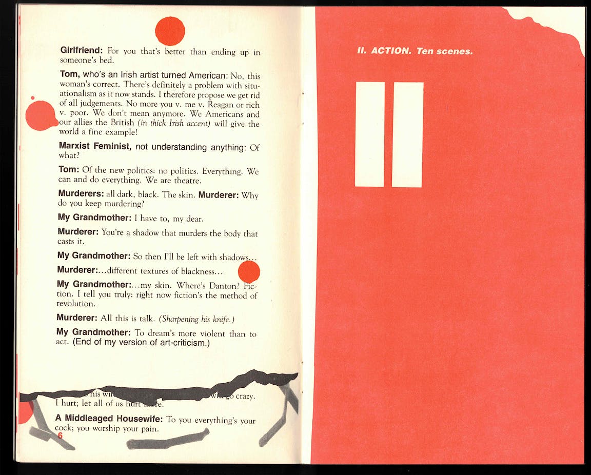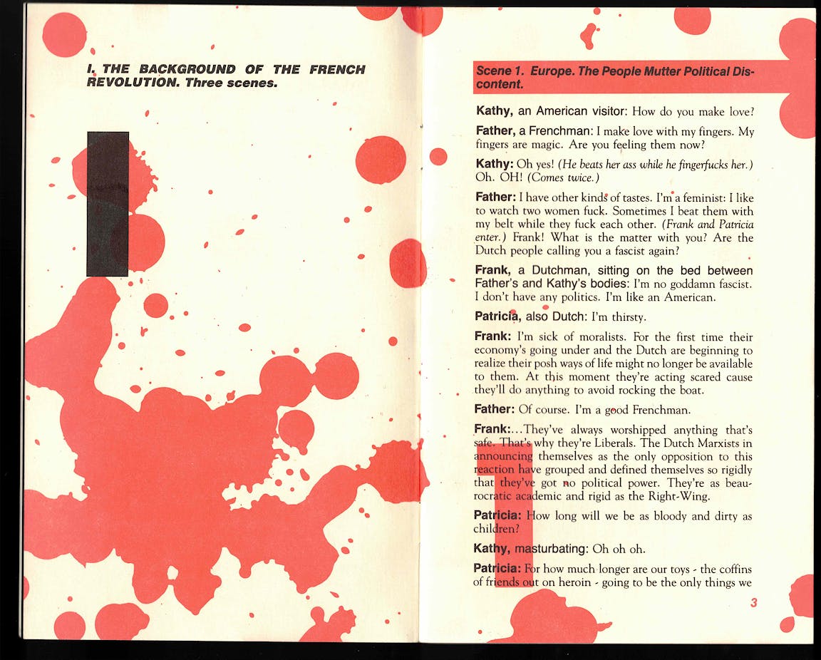 Opening the book is like walking into a crime scene. The pages are blood-spattered and bright red as if still wet, a paper cut gone sideways. I check my fingers for signs of injury. More visual clues appear throughout: an open matchbook, a torn page, a ripped-up photograph. Meanwhile, Acker sets the stage. WHAT: The French Revolution. WHERE: Modern-day (1983) New York City. WHO: An unlikely cast of characters with names like My Grandmother, Situationist With Italian Accent, Marxist Feminist, Robespierre, Beautiful Blonde, and, in Acker fashion, Kathy herself. Absent linear plot, the play offers a series of graphic disjunctions. This isn’t your typical whodunnit. And even though the killer runs free, Implosion isn’t a cold case; it is hot, hot, hot. I start to sweat. I’m beginning to suspect, too late, that I am the victim, and the book is the—!